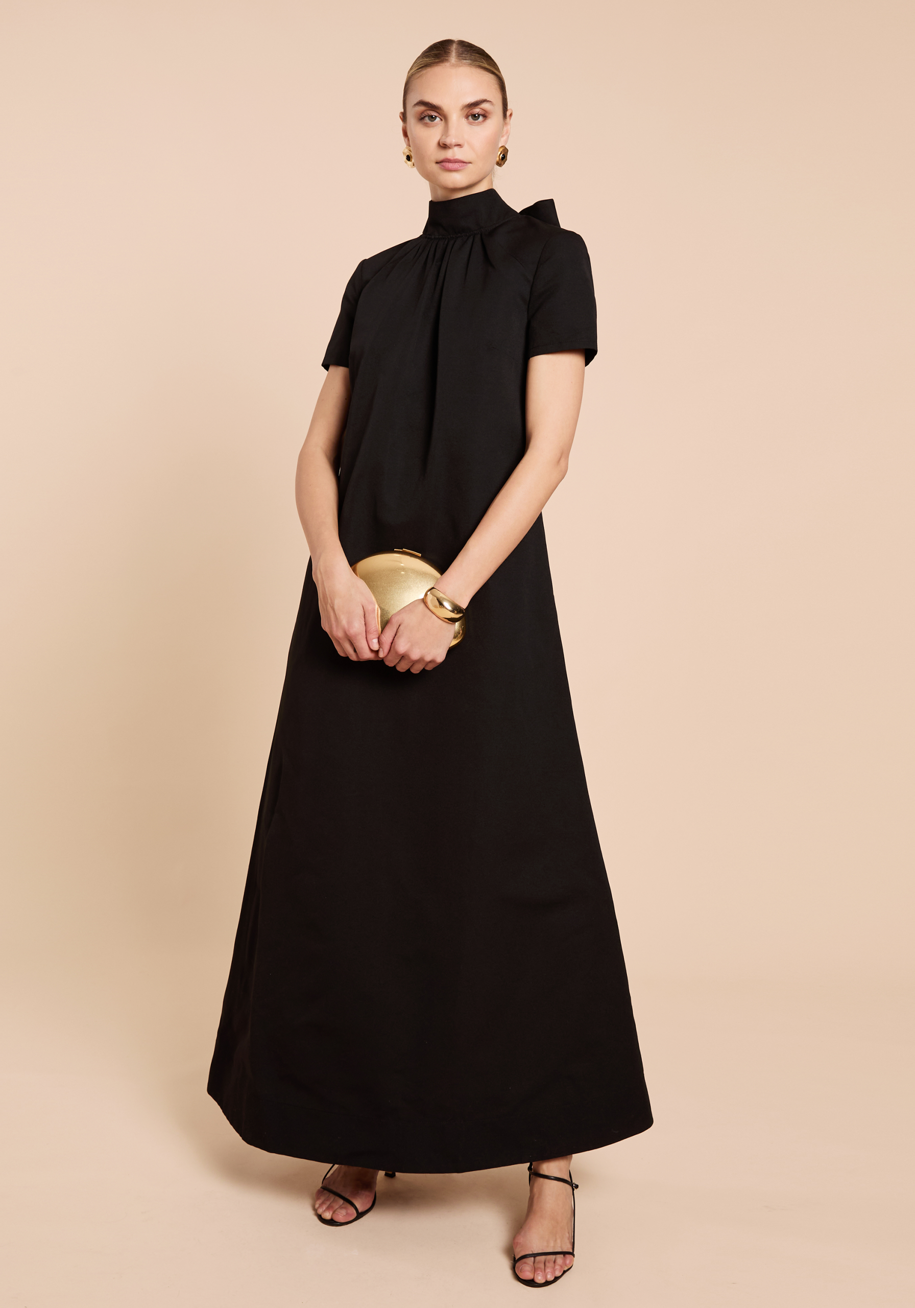 The Ciana Dress is crafted from structured fabric for an ultra elevated look. Its maxi length creates a graceful, elongated silhouette, while the elegant high neckline is enhanced by a sophisticated back bow detail, combining classic elegance with contemporary design for a polished look.