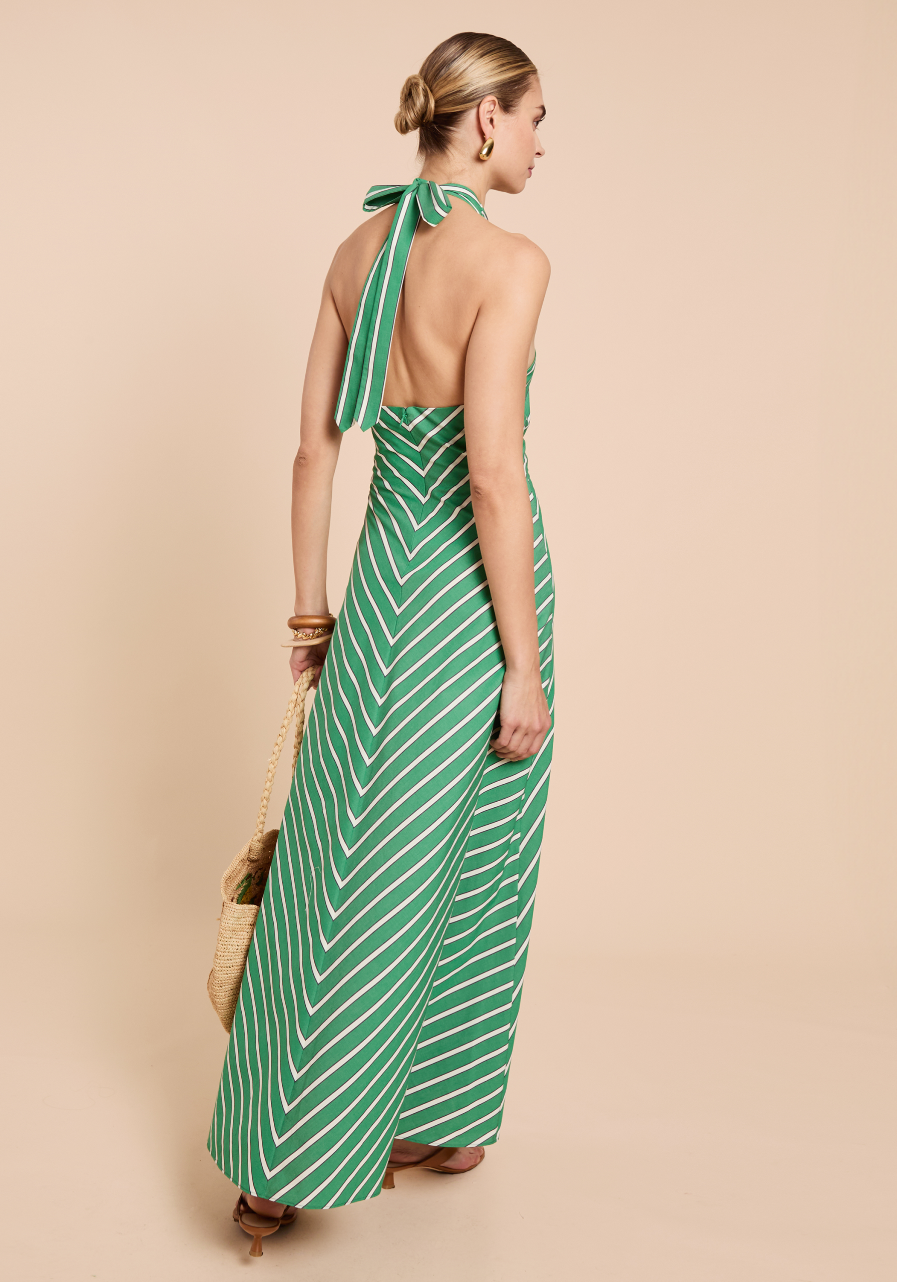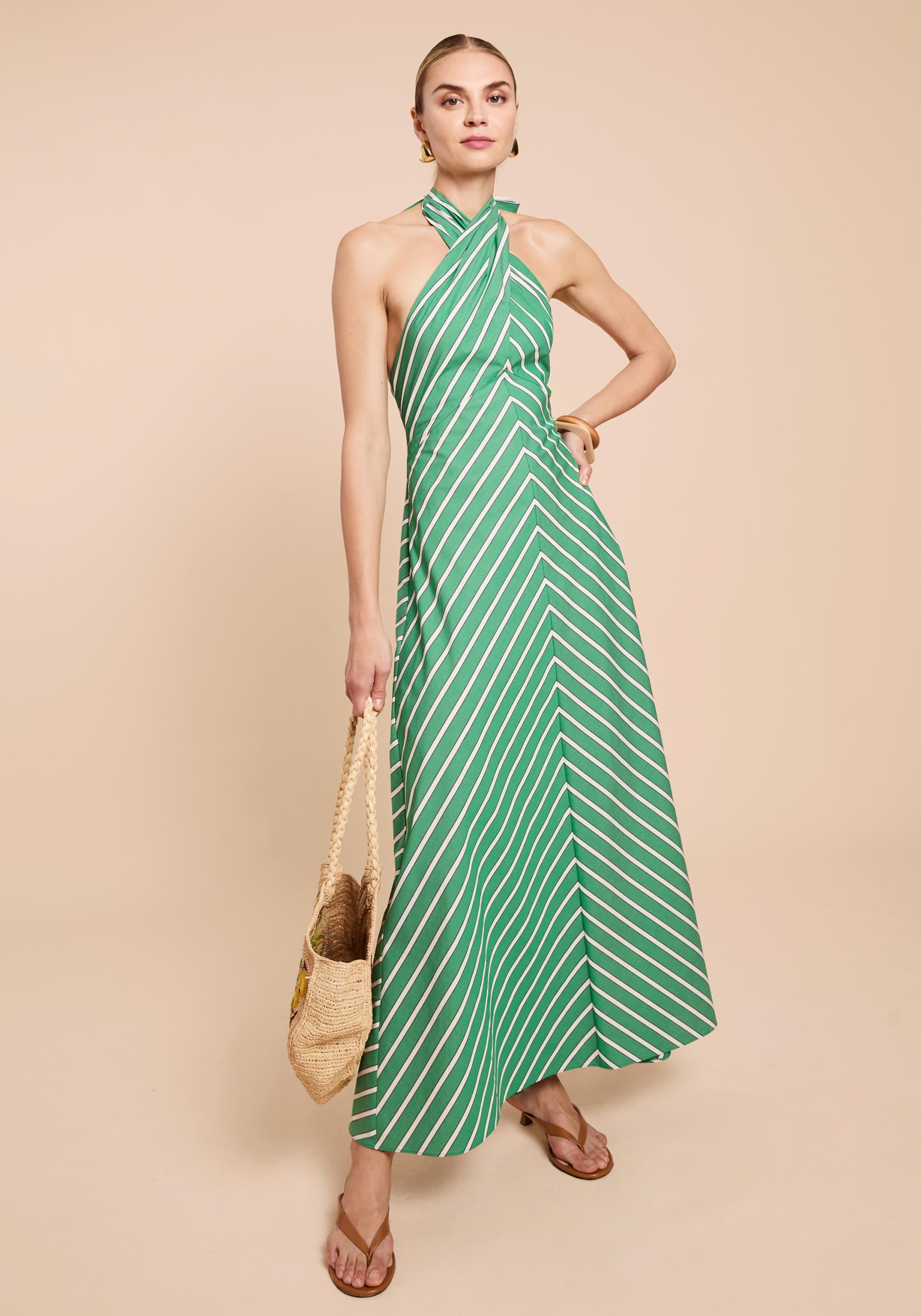The Noelle Cotton Dress features a halter neck design crafted from fresh, breathable cotton for all-day comfort. Its crisp green striped print adds a refined touch, while the maxi length offers effortless elegance. Perfect for an easy chic look, this dress combines style and comfort seamlessly.
